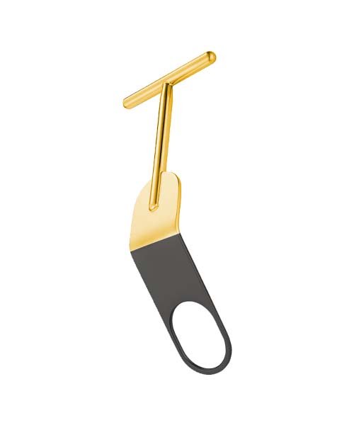 - This retractor features a T-shaped piece that is affixed to a flat slightly bent fenestrated piece.